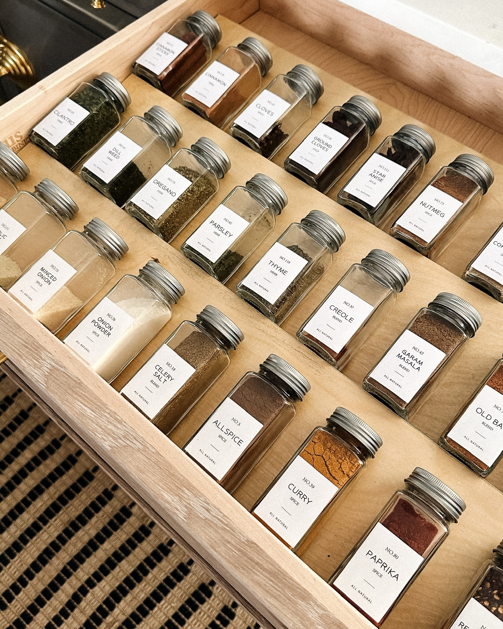 It only took me this long to realize just how game changing having a perfectly organized, clearly labeled spice drawer is for a home kitchen. Even if you don’t have a designated drawer for your spices and keep them in the pantry or on a lazy susan, these clear jars with labels make finding exactly what you need so much easier and faster. Watch me organize my spices here!