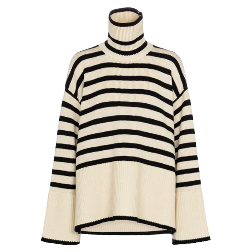 This striped turtleneck sweater is a Totême signature. Note the long, dropped sleeves and the split hemline that creates a naturally wide silhouette with a beautiful drape. This beige and black design is instantly a classic. Grab the reverse black and beige version here. Fit is oversized; I wear an XS.